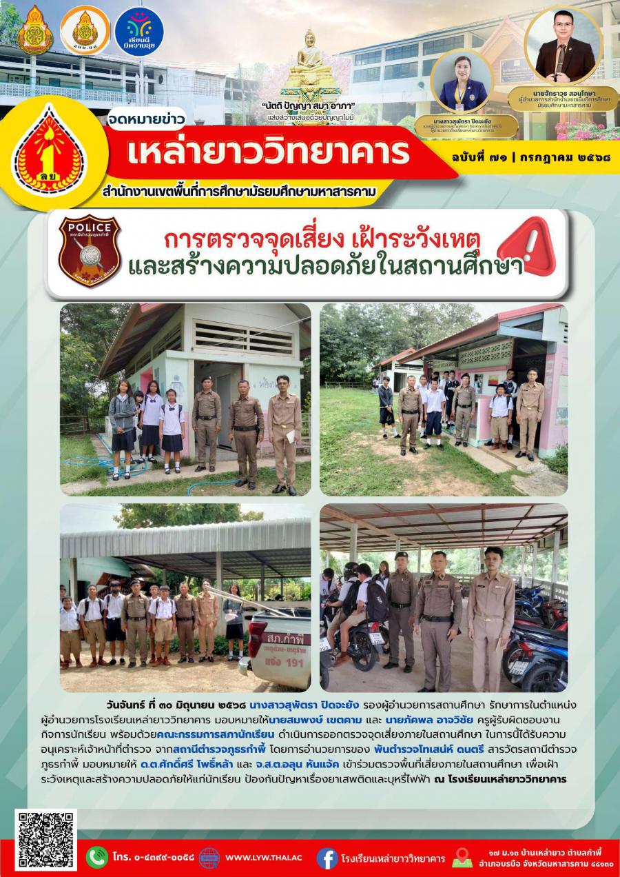 วันจันทร์ ที่ ๓๐ มิถุนายน ๒๕๖๘ นางสาวสุพัตรา ปิดจะยัง รองผู้อำนวยการสถานศึกษา รักษาการในตำแหน่งผู้อำนวยการโรงเรียนเหล่ายาววิทยาคาร มอบหมายให้นายสมพงษ์ เขตคาม และ นายภัคพล อาจวิชัย ครูผู้รับผิดชอบงานกิจการนักเรียน พร้อมด้วยคณะกรรมการสภานักเรียน ดำเนินการออกตรวจจุดเสี่ยงภายในสถานศึกษา ในการนี้ได้รับความอนุเคราะห์เจ้าหน้าที่ตำรวจ จากสถานีตำรวจภูธรกำพี้ โดยการอำนวยการของ พันตำรวจโทเสน่ห์ ดนตรี สารวัตรสถานีตำรวจภูธรกำพี้ มอบหมายให้ ด.ต.ศักดิ์ศรี โพธิ์หล้า และ จ.ส.ต.อลุน หันแจ้ค เข้าร่วมตรวจพื้นที่เสี่ยงภายในสถานศึกษา เพื่อเฝ้าระวังเหตุและสร้างความปลอดภัยให้แก่นักเรียน ป้องกันปัญหาเรื่องยาเสพติดและบุหรี่ไฟฟ้า ณ โรงเรียนเหล่ายาววิทยาคาร