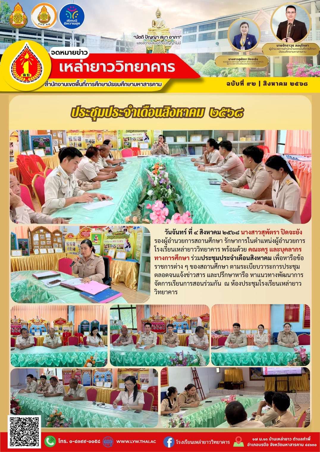 วันจันทร์ ที่ ๔ สิงหาคม ๒๕๖๘ นางสาวสุพัตรา ปิดจะยัง รองผู้อำนวยการสถานศึกษา รักษาการในตำแหน่งผู้อำนวยการโรงเรียนเหล่ายาววิทยาคาร พร้อมด้วย คณะครู และบุคลากรทางการศึกษา ร่วมประชุมประจำเดือนสิงหาคม เพื่
